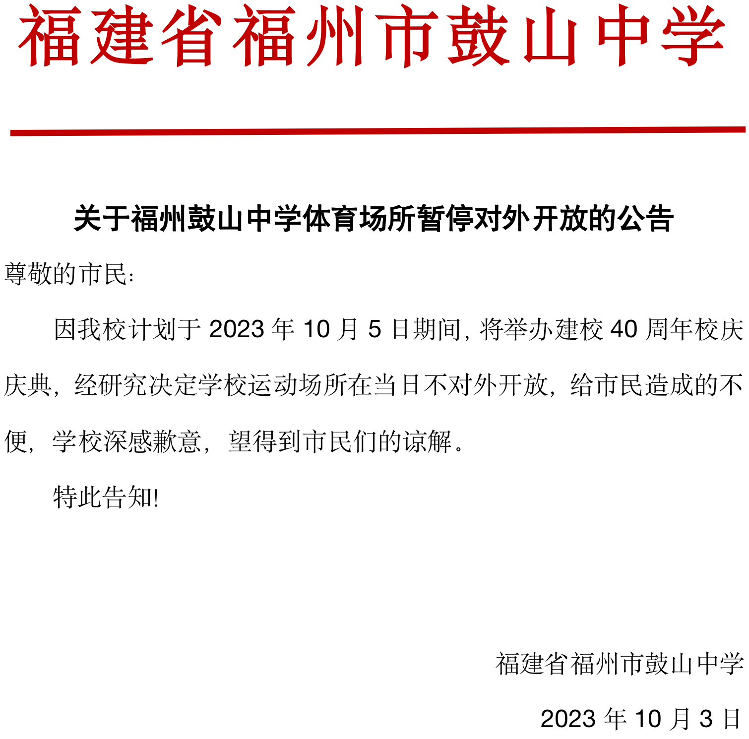 关于福州鼓山中学体育场所暂停对外开放的公告